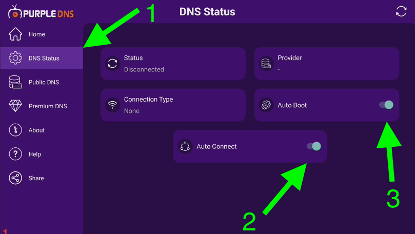 2 – Cliquez sur DNS Status sur le panneau gauche et activer AUTO BOOT ET AUTO CONNECT: ceci afin de permettre le lancement & connexion automatique de l’application lorsque vous lancez votre appareil.