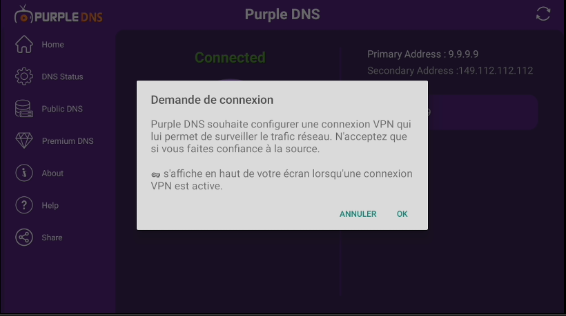 6 – Pour que Purple DNS filtre votre trafic, il doit créer une connexion VPN locale (cela ne change pas votre IP comme un vrai VPN, mais permet de filtrer les requêtes DNS) – Acceptez-les pour qu’elle puisse fonctionner, cliquez donc sur OK.