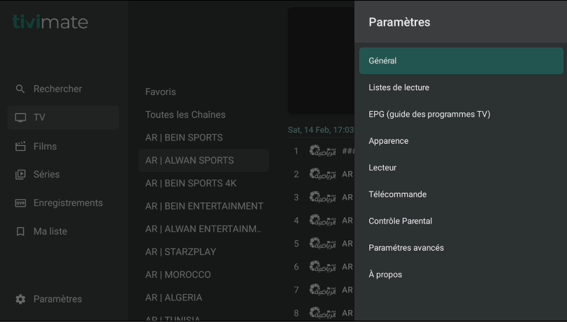 1 – Lancez l’application TiviMate et cliquez sur « Paramètres » à votre gauche
